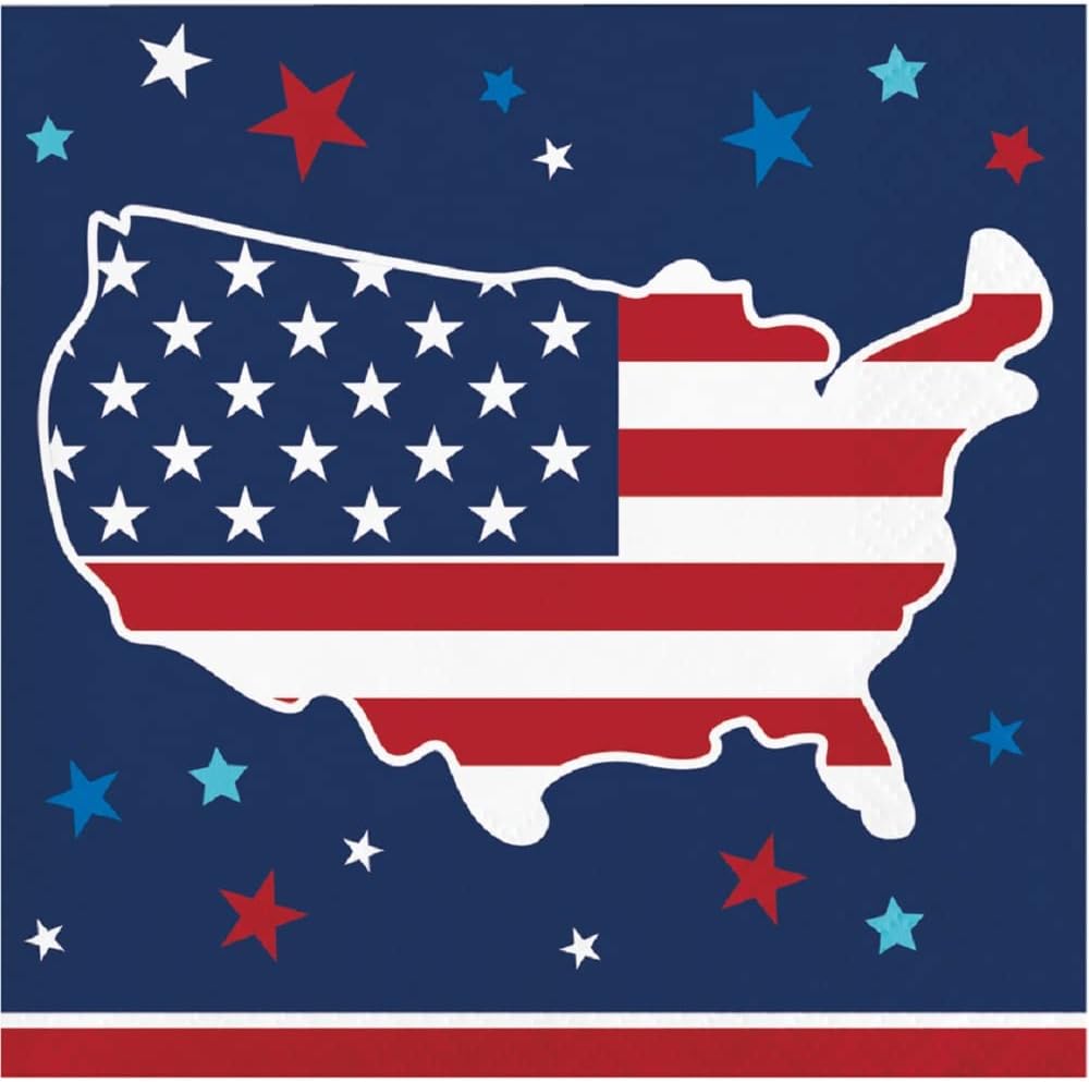 32 Count - Patriotic Freedom Fireworks Disposable Cocktail Beverage Napkins Napkins are 2-ply thick and measure 5 inch, folded. Fits most standard beverage napkin holders Freedom Fireworks Design features the stars and stripes of our American flag in the shape of the United States, with a blue and multicolor star backgound Adds a pop patriotic color to the dining table or drink table