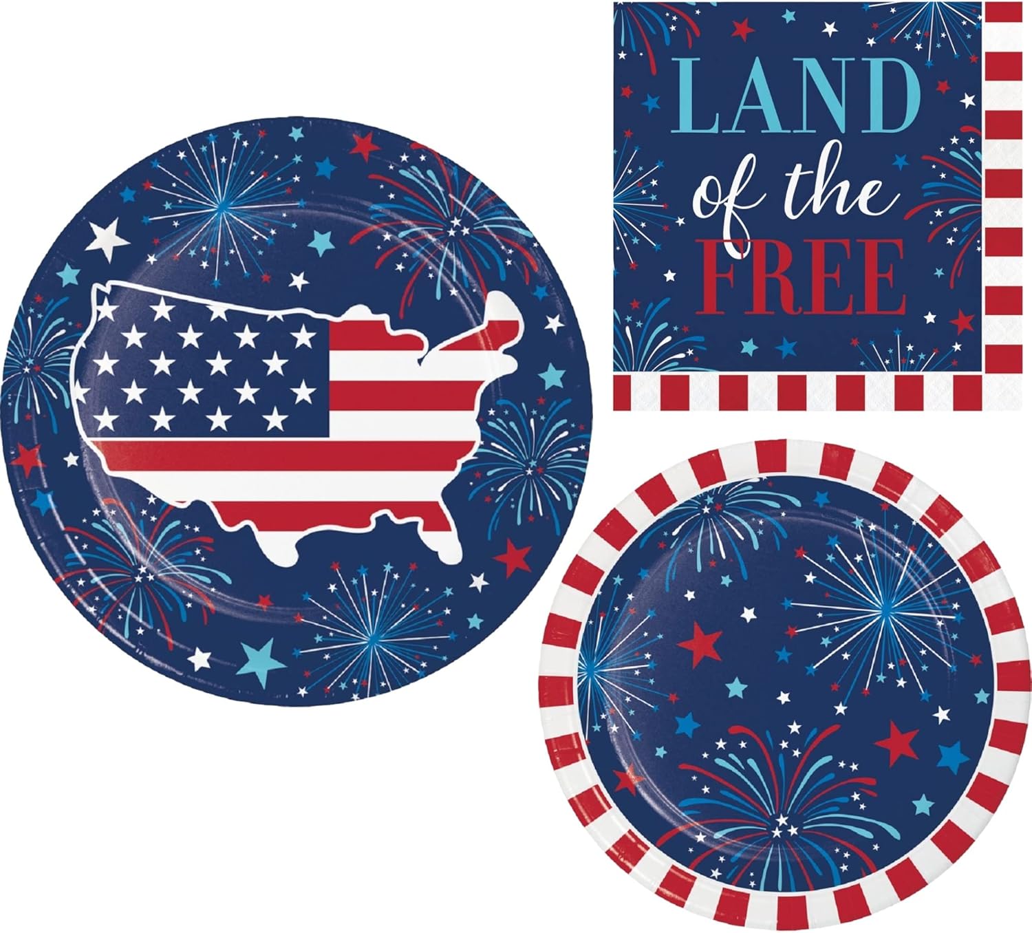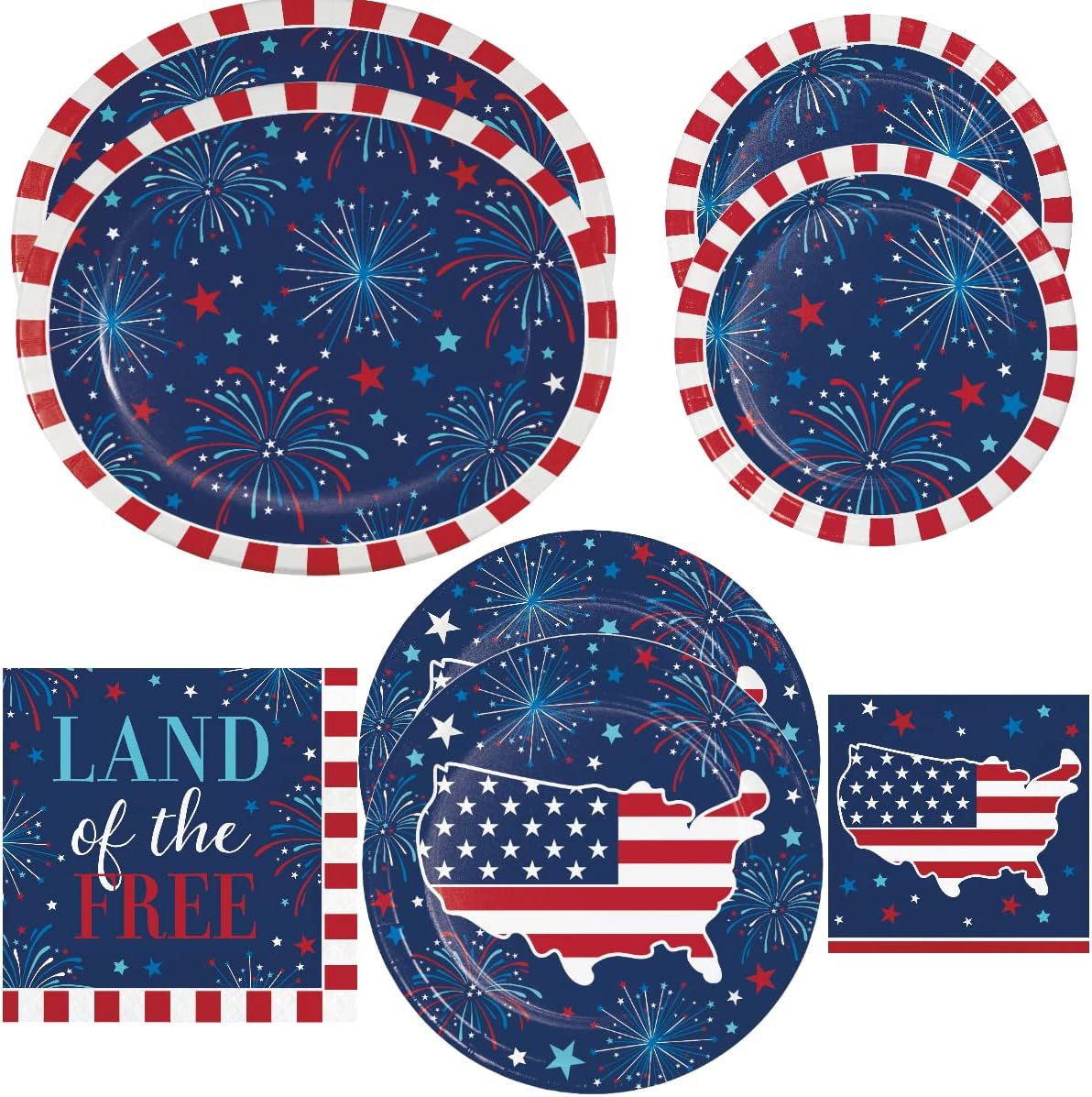 Embrace Patriotism with Freedom Fireworks Theme: Enjoy summer holidays with our red, white, and blue US-inspired design, stars & stripes, and dazzling fireworks! πΊπΈπ High-Quality Tableware for 16 Guests: Our 80-piece set includes 16 Banquet Platters (10" x 12"), 16 Dinner Plates (9"), 16 Dessert Plates (7"), 16 Luncheon Napkins (6.5), and 16 Beverage Napkins (5"), all made with premium strength material for durability and sturdiness. Celebrate Memorial Day & 4th of July: Bring family and friends together for festive gatherings with our Freedom Fireworks collection. Hassle-Free Cleanup: Enjoy more time with loved ones at your patriotic-themed party, thanks to our disposable paper tableware for easy cleanup!
