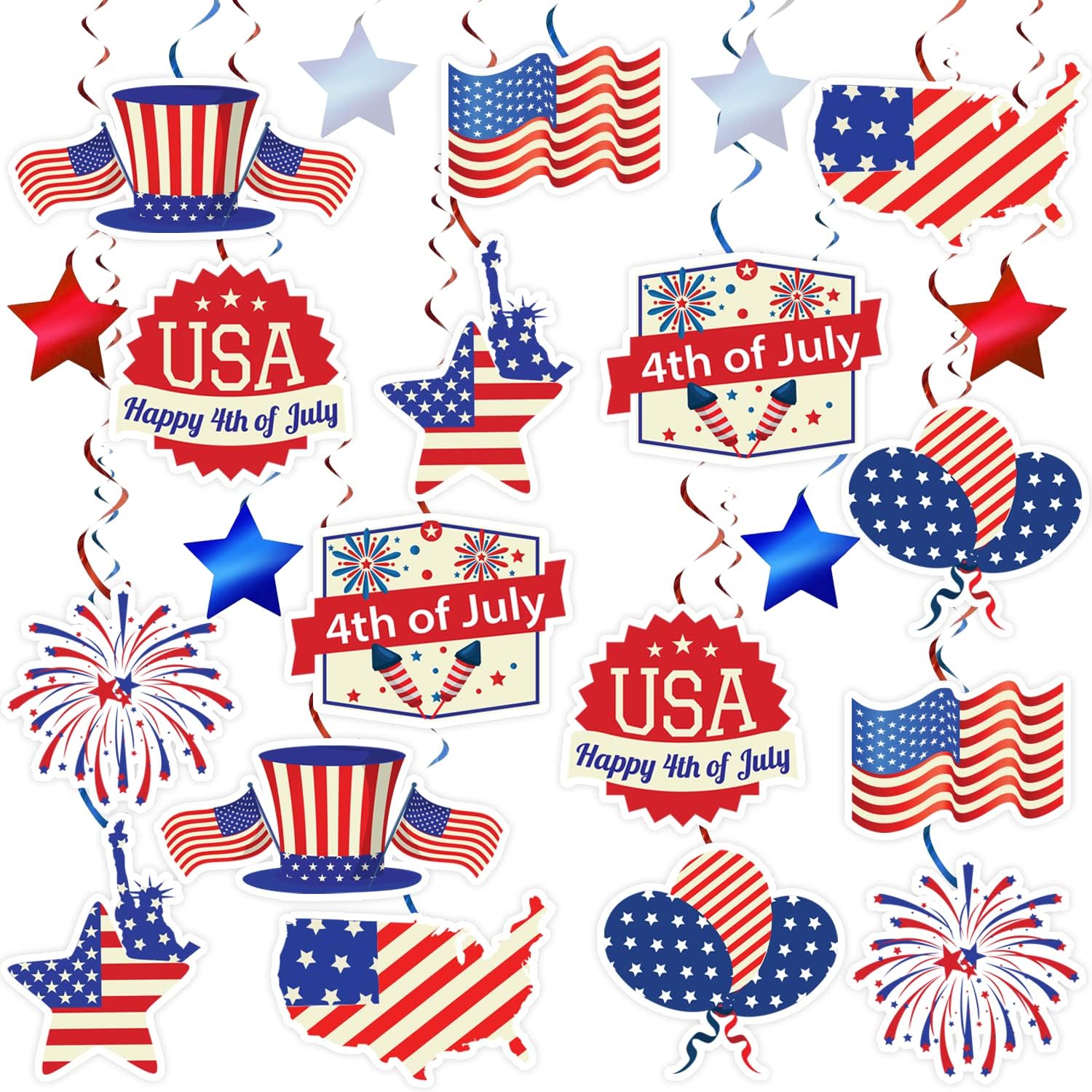 Super Value Pack: 36 pcs colorful classic Independence Day red and blue hanging swirls, including 6pcs hanging swirl with star (Bluex2, Redx2, Silverx2), 10pcs hanging swirl with 5 different kinds of double-sided printing cards and 14pcs double swirls (Silverx4, Bluex4, Redx6). ★ Durable & Reusable: These hanging swirl decorations firework, flag and star cards are made of durable paper card and swirl is shinny foil material, making it lightweight, durable and reusable and fit for outdoor and indoor occasion.