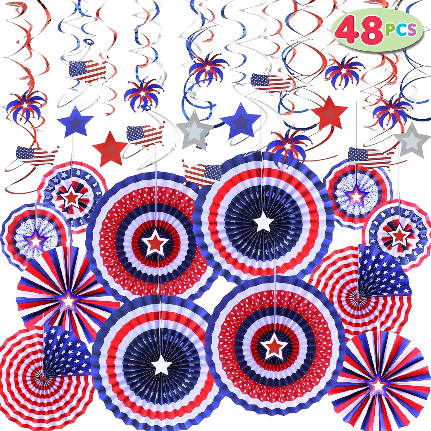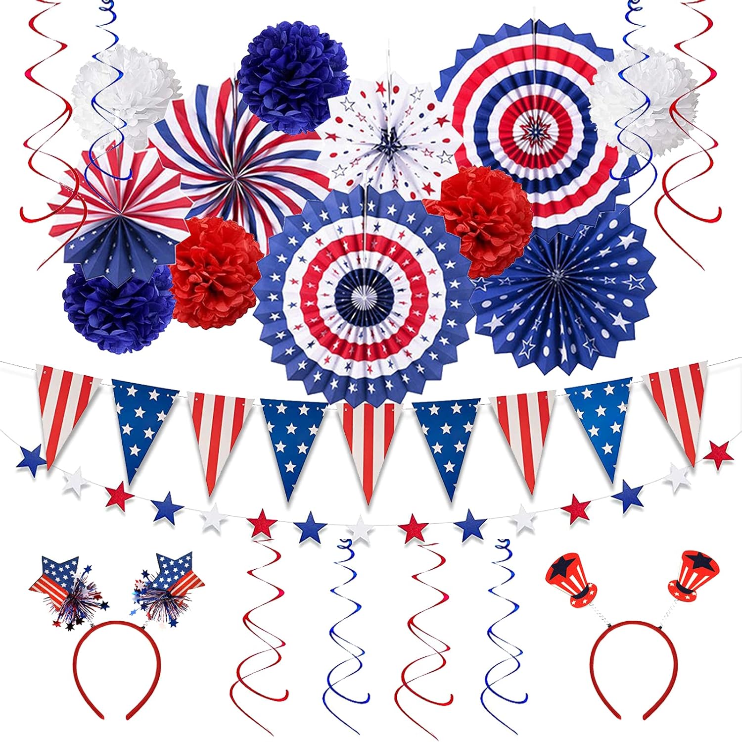 4th of July Decorations- Set of 25, the package includes 12pcs swirl streamers(6 x Red, 6 x Blue) 6pcs paper fans, 4pcs paper flower balls (2 x Red, 1 x White, 1 x Blue), 1pc star string , 1pc American flag string banner, 1pc pennant string banner. Multiple decorations for you to choose and perfect for any American celebration.