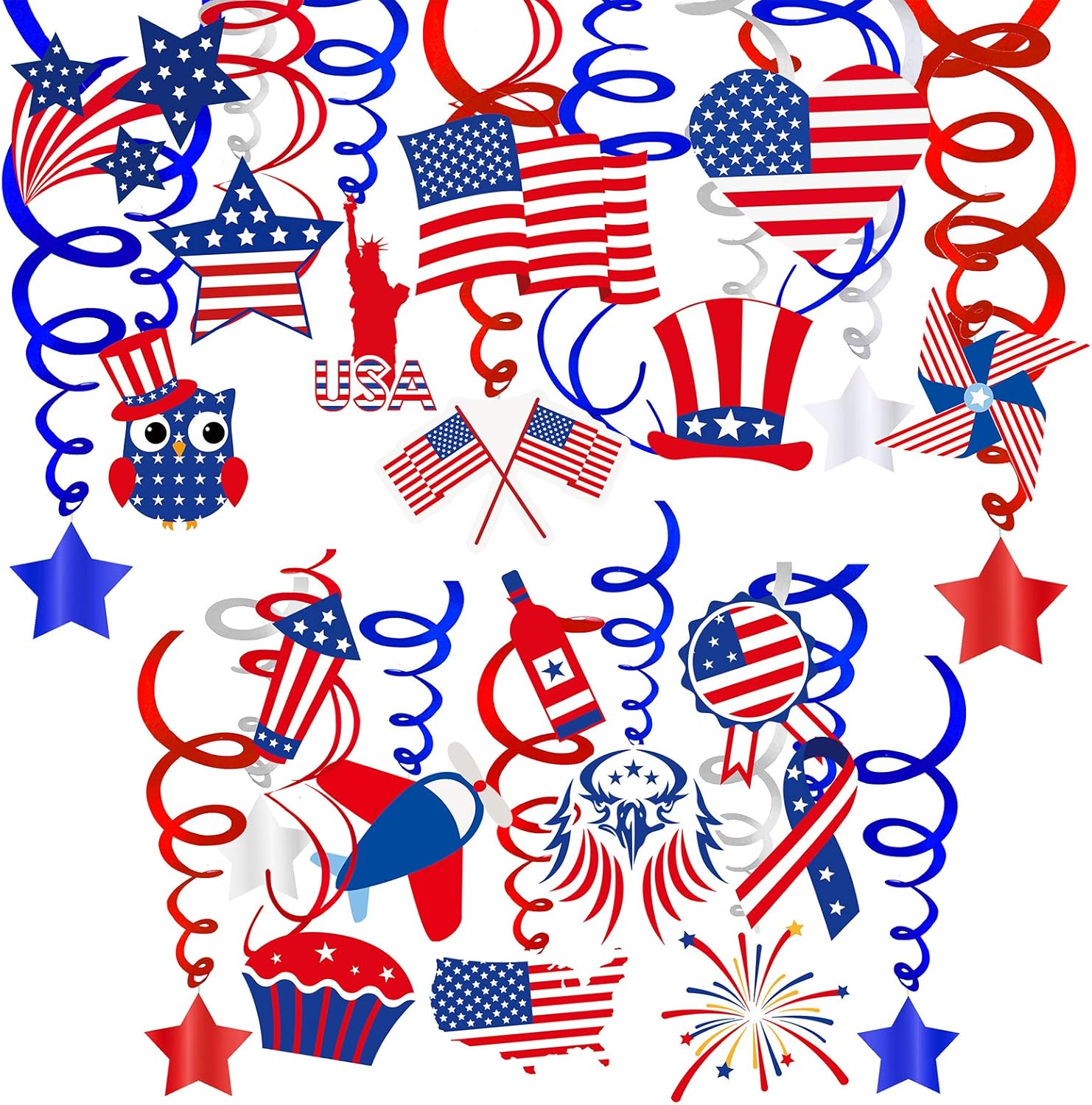 atriotic Party Decoration includes: 13.2' Long Patriotic Tinsel Garlands in 2 styles, 27 Pcs Patriotic Hanging Swirl Streamers (12 Pcs paper cutouts & 12 single swirls, 9 Pcs plain double swirls, 6 Pcs foil swirls with star cutouts), 8.2' Long Patriotic American Flag Bunting Banner, 8.2' Long USA Banner, 5.9' Long Foil Patriotic Star String and 8.2' Long Patriotic American Flag Bunting Banner. The Patriotic Banners come with paper raffia cord for hanging, simple assembly required.