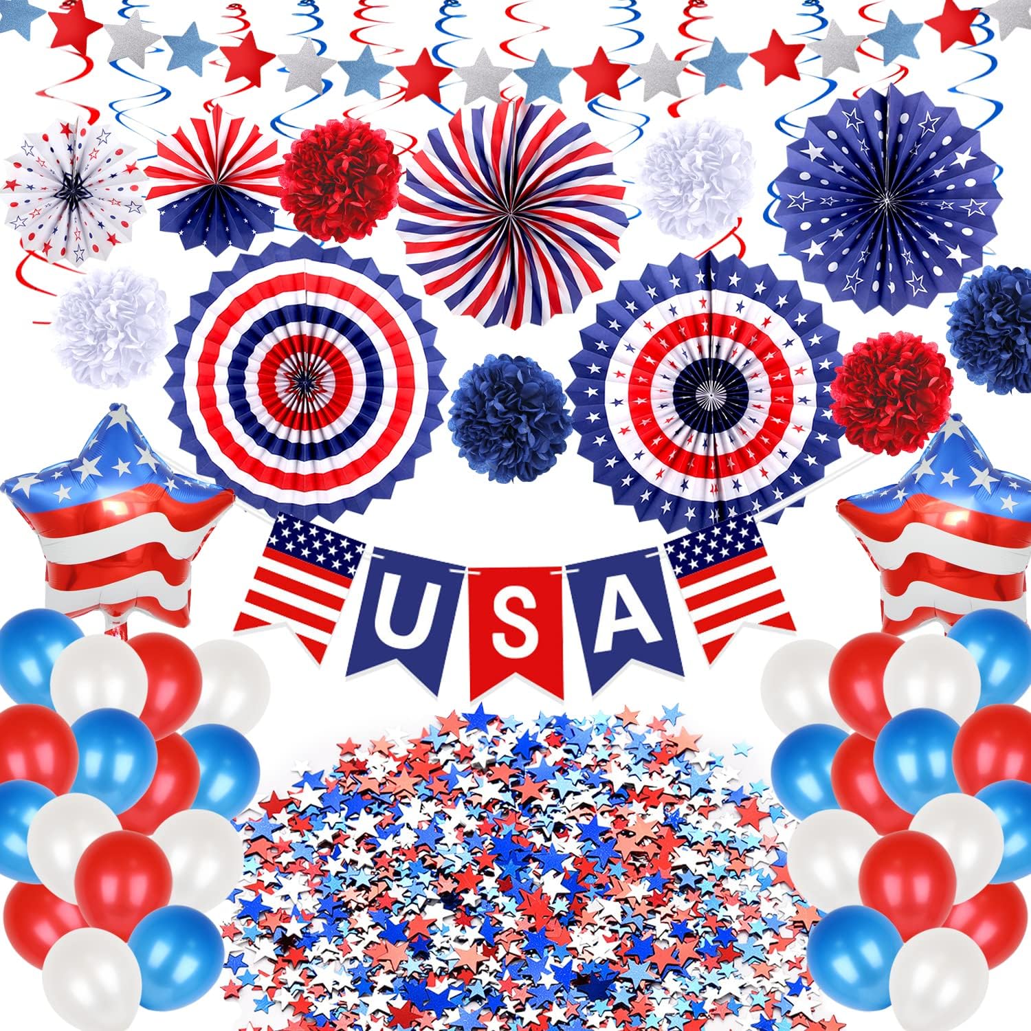 9 PACK PATRIOTIC DECOR SET - This 4th of july decorations package includes 6pcs different paper fans (3 sizes), 12pcs foil hanging swirls (2 colors), 6pcs paper pom poms(3 colors), 1pcs USA flag banner, 1pcs red blue silver star banner, 30 pcs latex balloons (10 x blue, 10 x red, 10 x white), 2 pcs foil balloons . 1 package of red blue white stars.59pcs in total.