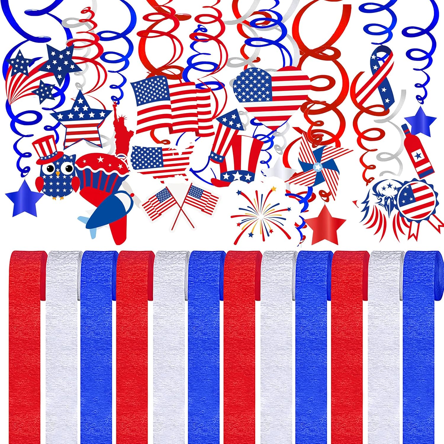 Quantity: This 48 Pack Fourth of July Decoration includes 12 Pcs patriotic crepe paper rolls in red, blue and white, 6 Pcs foil swirls with blue, red & silver star cutouts, 18 Pcs single swirls and 12 Pcs plain double swirls in blue, red & white, and 18 Pcs paper cutouts in assorted patriotic designs. Each swirl has a plastic hook for easy hanging.