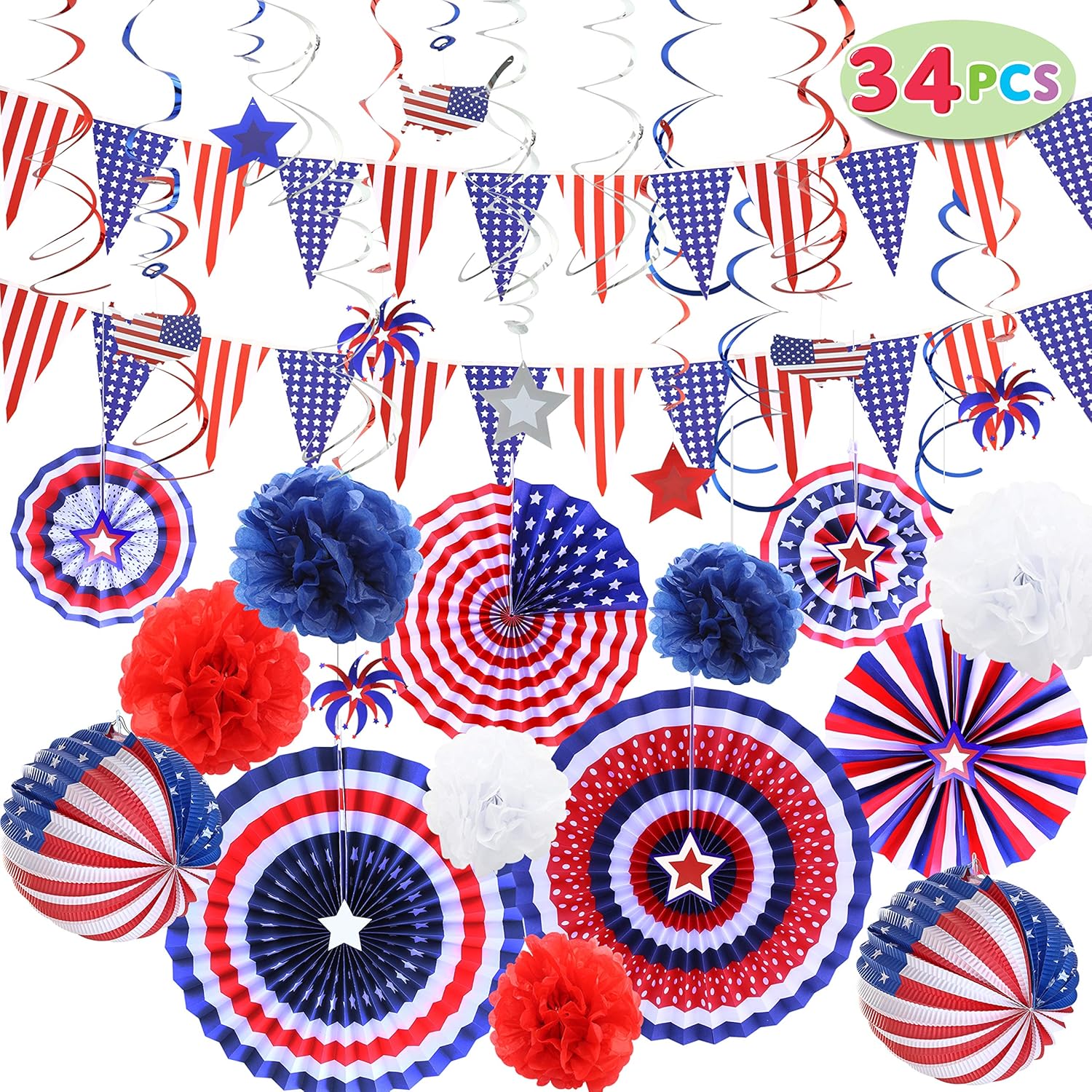 Patriotic Party Decorations Includes: 6 foldable hanging paper fans, 6 colorful paper pom poms(2white + 2red + 2navy blue), 12 hanging swirls(6red + 6blue), 1 American patriotic banner Love USA flag and 1 string of star streamer.