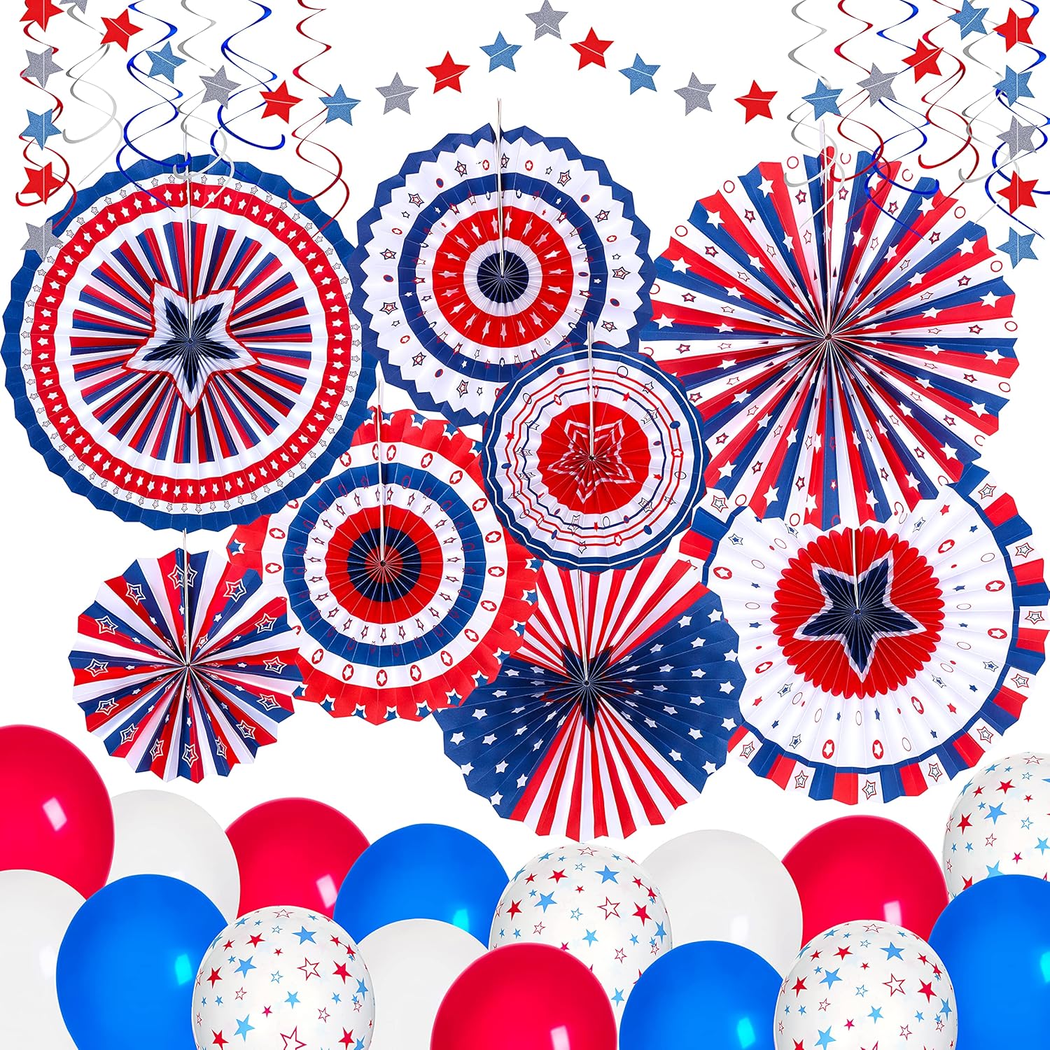 Come with 8pcs red white and blue paper fans with the assortment of patterns (both-sides printing) and sizes,1pcs star streamer with red blue and silver color,12pcs red silver and blue double hanging swirls decor and 16pcs balloons.37pcs in total. Material & Measure - paper fans are made of sturdy paper and in 3 sizes,15.5”,11.7” and 8” in diameter.Hanging swirls are made of plastic and measure approx.36” long.Star garland is 8ft.